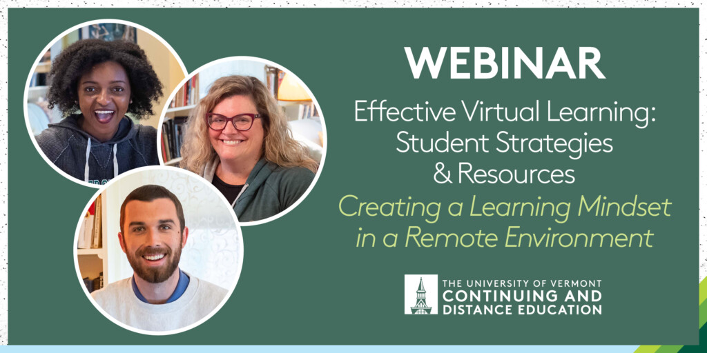 The University of Vermont Professional and Continuing Education recently hosted three free, informational webinars on Effective Virtual Learning: Student Strategies and Resources to examine how students can make the most of the many challenges they may be facing as remote college students this fall.
